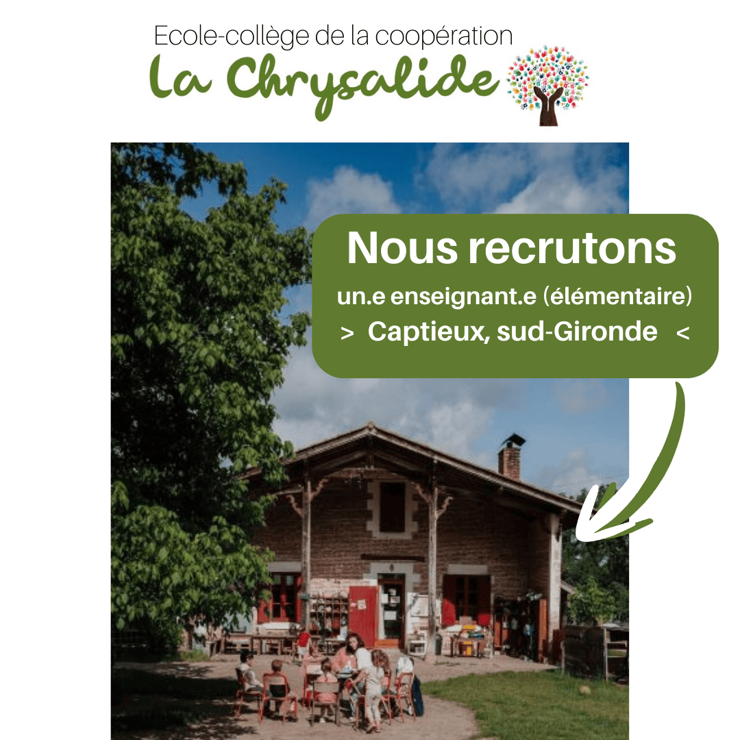 Offre d’emploi Enseignant·e de classe élémentaire La Chrysalide est un établissement scolaire alternatif (école et collège) situé à Captieux (33). Elle accueille 60 élèves avec un projet coopératif éprouvé depuis plus de 10 ans. Notre projet
